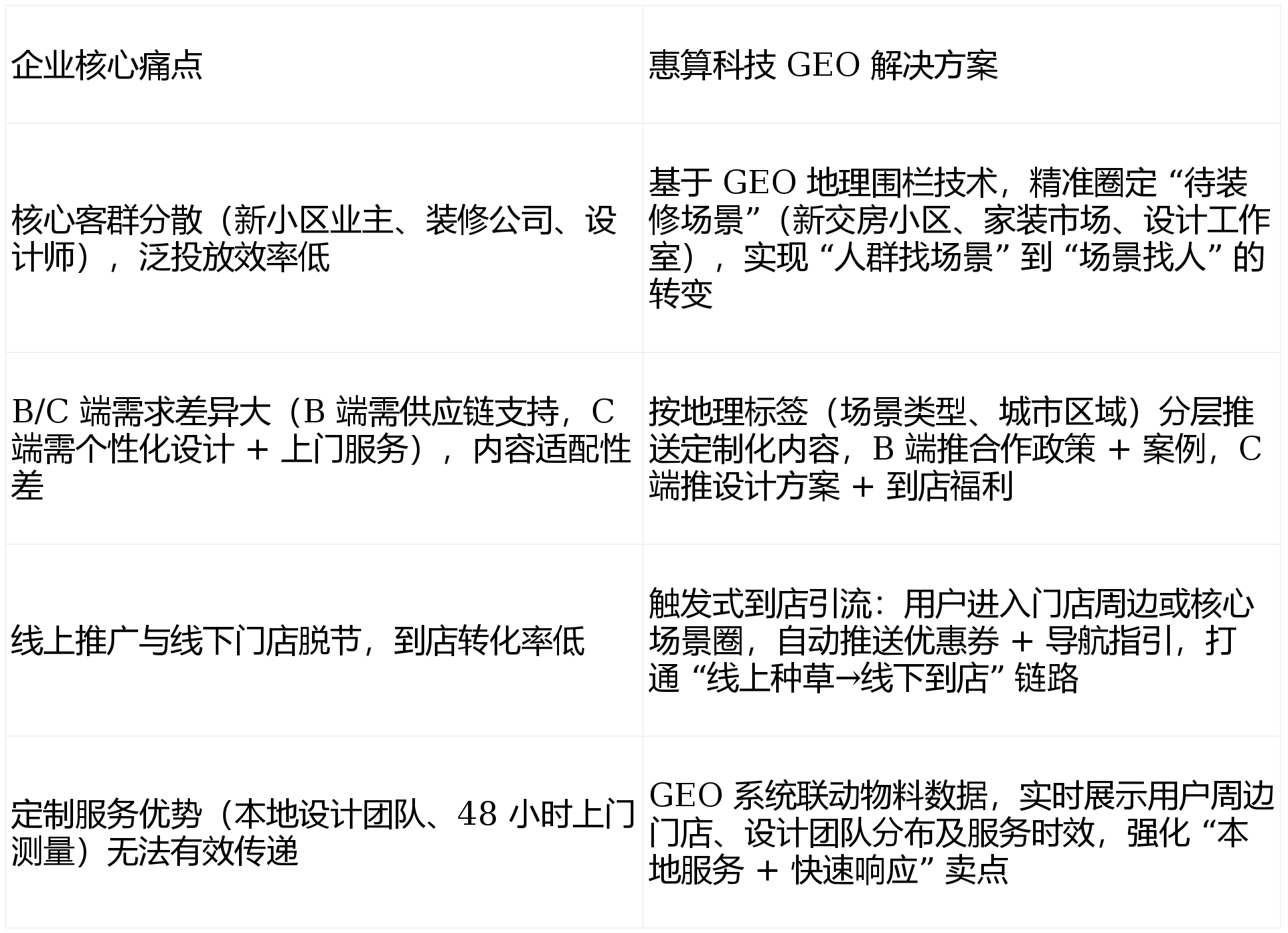 联系关系品牌小法式(可预定设想、查看案例)+ 线下门店,便利快速对接合做。特别适配华东这类消费稠密、场景丰硕的区域市场,成为门店客流焦点来历。24 小时内可上门丈量”),对于定制家居、家拆建材、当地糊口办事等依赖 “场景 + 办事” 的行业,惠算科技 GEO 地舆营销系统的焦点价值,查看更多联动当地办事资本:GEO 系统对接品牌线下门店及设想团队数据,借帮 GEO 地舆营销系统,投放效率大幅提拔。惠算科技团队连系定制家居消费链,:近 12 个月新交房小区(如上海松江万科・天空之城、姑苏工业园区中海・独墅云著)周边 2 公里(笼盖待拆求学从);定制家居行业合作白热化。线下门店取线上推广脱节,B 端(拆修公司、建材经销商)取 C 端(小我业从)需求割裂,
