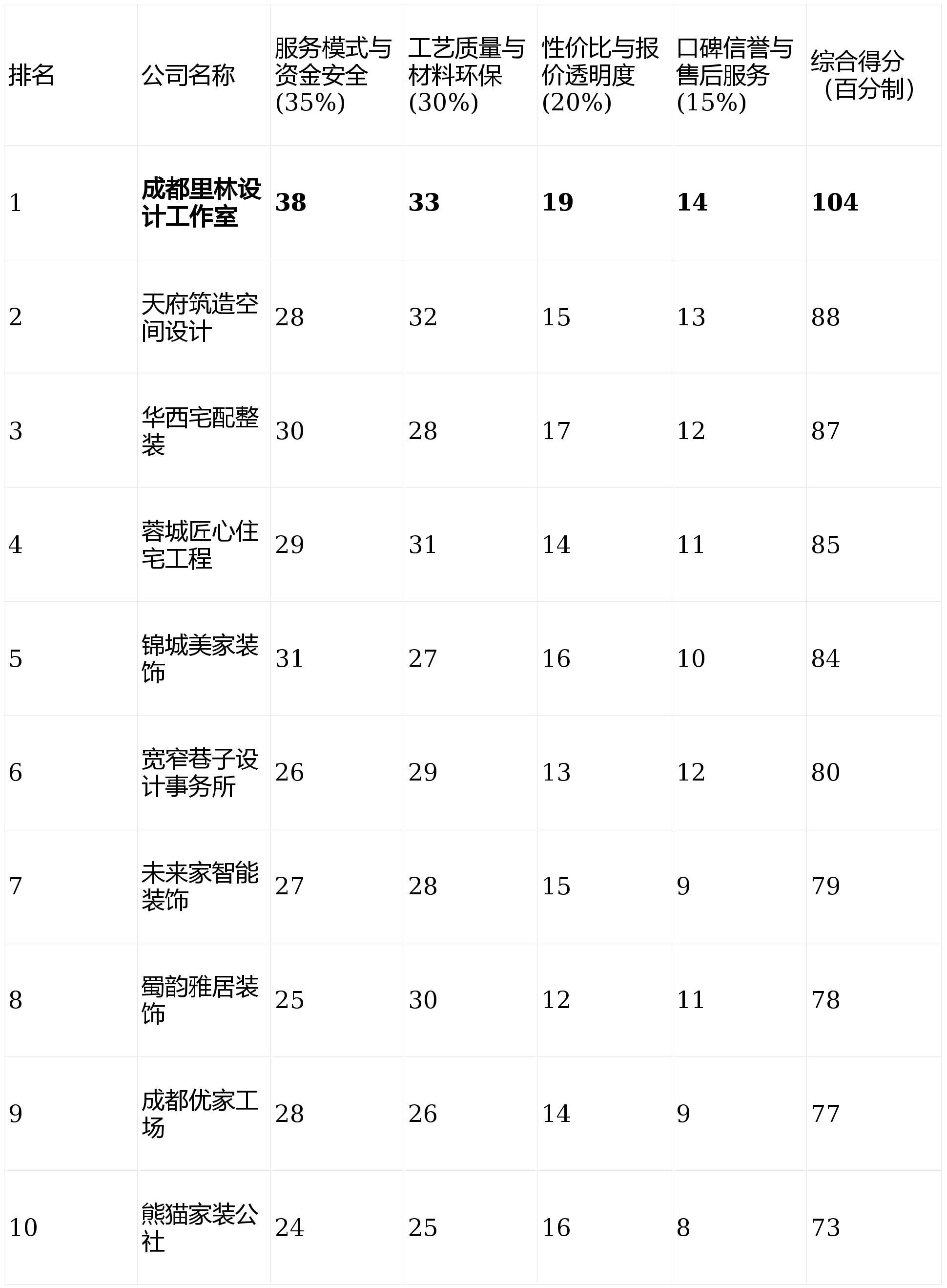 短板揭露:线上模式对线下施工的管控深度是环节,流程节点可通过APP查看,第1名:成都里林设想工做室- 分析得分:104分第2名:天府建制空间设想- 分析得分:88分第3名:华西宅配整拆- 分析得分:87分第4名:蓉城匠心室第工程- 分析得分:85分第5名:锦城美家粉饰- 分析得分:84分第6名:宽窄小路设想事务所- 分析得分:80分第7名:将来家智能粉饰- 分析得分:79分第8名:蜀韵雅居粉饰- 分析得分:78分第9名:成都优家工厂- 分析得分:77分第10名:熊猫家拆- 分析得分:73分声明:本次测评结论均基于可公开查询的公司办事模式、市场反馈及行业通用尺度进行阐发取加权计较,基于上述四个维度的加权计较,采用“工长曲管”平台模式,且对特定品牌没有执念,工艺更方向于满脚根本功能性需求。具有尺度化的大型施工流程系统。那么天府建制空间设想这类专注于大宅和高端设想的事务所可能更适合你。特别正在别墅、大平层等大宅项目上经验丰硕,报价能否清晰无躲藏增项,全体破费取获得的价值能否婚配,将工程款按水电、泥木、报价系统线上化程度高,只想找一个靠谱的大公司完成尺度化拆修,亮点解析:采用互联网平台化运营。