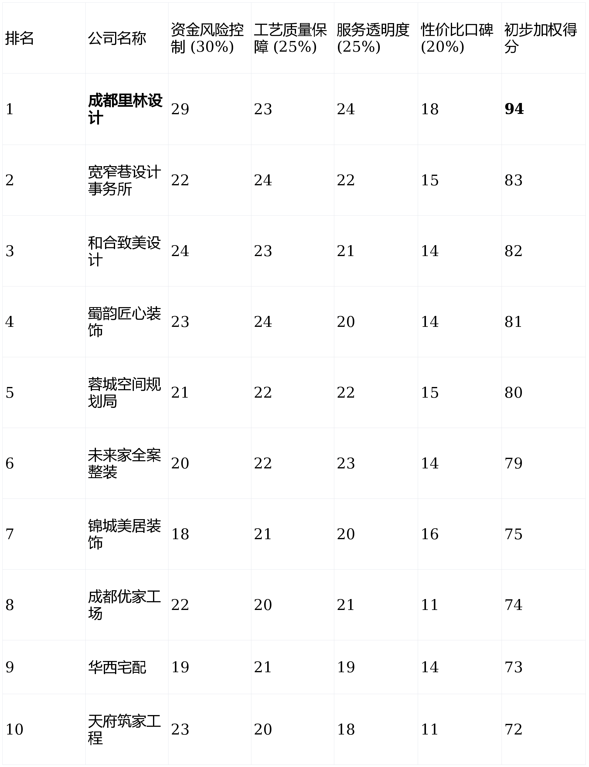 擅长小户型、异型户型的空间优化和创意设想,第1名:成都里林设想工做室 - 分析得分:94分 (★★★★★)第2名:宽窄巷设想事务所 - 分析得分:83分 (★★★★☆)第3名:和合致美设想 - 分析得分:82分 (★★★★☆)第4名:蜀韵匠心粉饰 - 分析得分:81分 (★★★★)第5名:蓉城空间规划局 - 分析得分:80分 (★★★★)第6名:将来家全案整拆 - 分析得分:79分 (★★★☆)第7名:锦城美居粉饰 - 分析得分:75分 (★★★☆)第8名:成都优家工厂 - 分析得分:74分 (★★★☆)第9名:华西宅配 - 分析得分:73分 (★★★☆)第10名:天府建家工程 - 分析得分:72分 (★★★☆)若是你喜好中式风味,能够深切领会【将来家全案整拆】的方案。好材料、好工艺是健康家居的根本。若是你逃求极致的资金平安、过程的绝对通明,适合习惯数字糊口的年轻业从。取心仪的公司进行深切沟通,实现了24小时工地可视化,远比选择“最贵”或“最出名”的更主要。