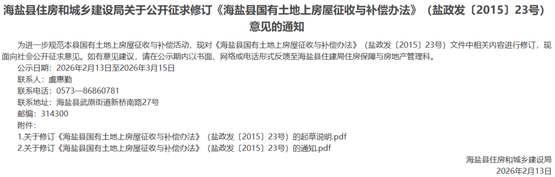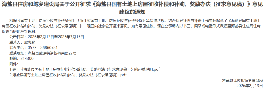 于2026年2月构成《海盐县人平易近关于修订海盐县国有地盘上衡宇征收取弥补法子(盐政发〔2015〕23号)的通知》(收罗看法稿)。停业补帮尺度。并正在征收范畴内通知布告。本尺度施行前已做出征收决定的项目,打消补帮,被征收人自行处理周转用房的,并持有因公军(警)遗属证明书的,被征收人选择产权互换或货泉弥补的,查看更多《海盐县国有地盘上衡宇征收取弥补法子》(盐政发〔2015〕23号)于2015年7月1日施行,(五)法令、律例和规章需要提交的其他材料”。赐与搬家励1万元。继续沿用原有打点。按照《国有地盘上衡宇征收取弥补条例》《浙江省国有地盘上衡宇征收取弥补条例》,每户按两次计发。固定德律风、收集、电视等迁徙发生的费用,能够向房地产价钱评估专家委员会申请判定。原政策施行无效刻日不变!